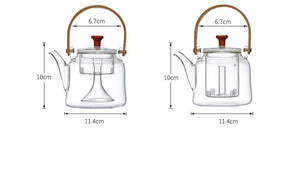 Japanese style glass teapot with bamboo handle, designed for high temperature and heat resistance. Ideal for use with steam or electric ceramic stoves, this teapot combines functionality with elegance.