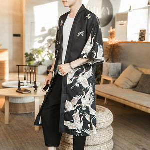 A graceful blend of tradition and modern comfort, the Tsuru Kimono Long Cardigan features crane motifs that symbolize peace, longevity, and elegance in Japanese culture.