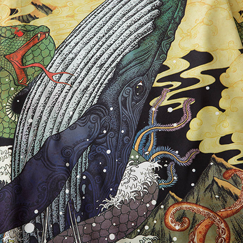 Crafted from lightweight polyester for a soft, airy feel, it features flowing prints reminiscent of classic Edo-period artwork—waves, cranes, mountains, and mystical patterns. With its loose fit, stand-up collar, and no-button open front, this kimono-style shirt radiates relaxed elegance. Ideal for festivals, photoshoots, or just everyday fashion with flair.