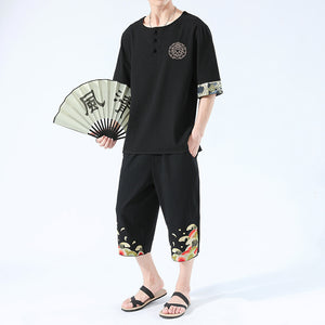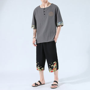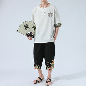 Zen Yukata Summer Wear – Embroidered Linen T-Shirt & Trousers Set